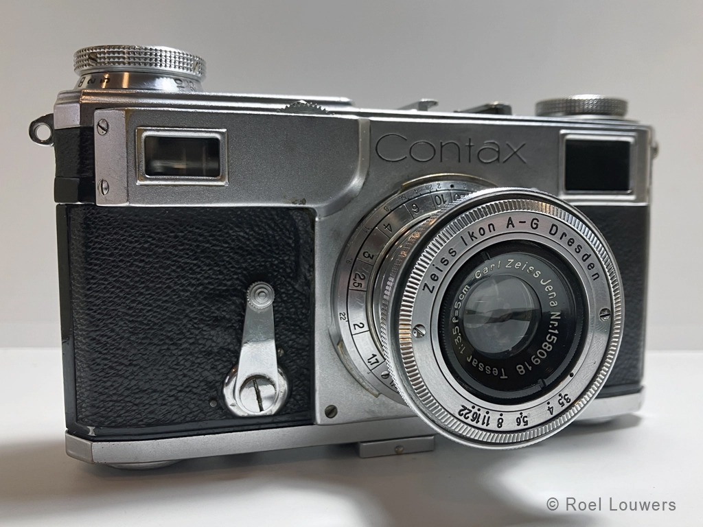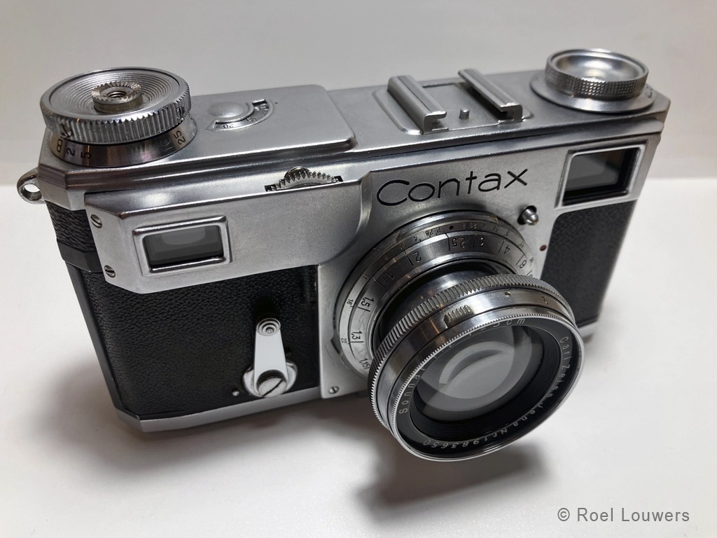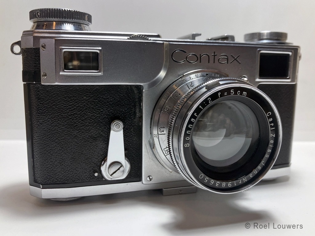 Contax II (1936-1942). De Zeiss Ikon Contax II (type 534/24) is een 35mm rangefinder camera en is de opvolger van de onbetrouwbare Contax (Contax I, 1932- … ) en verscheen in 1936 op de markt en bleef in produktie tot ongeveer het midden van 1942. De rangefinder en viewfinder zijn gecombineerd in één enkel oculair en doordat de rangefinder breed is, is die zeer accuraat in scherpstellen. De camera werd geleverd met 5cm f/2 Sonnar-lens, 5cm f/1.5 Sonnar, een 5cm f/2.8 of 5cm f/3.5 Tessar-lens. Scherpstellen gebeurt door aan het wieltje te draaien, welke zich op de bovenkant van de frontplaat op de camera bevindt. De sluiter bestaat uit twee metalen lamellen en beweegt zich verticaal, in tegenstelling tot zijn tijdgenoot ,de Leica’s, die horizontaal beweegt. De twee lamellen zijn middels een koord met elkaar verbonden. Hoewel de Contax II een betrouwbare camera is, zijn de koorden na jaren vaak gebroken door uitdroging en de spanning die er op staat. De lenzen zijn uitwisselbaar en worden middels een bajonetsluiting aan de body bevestigd. Dit maakt het mogelijk om b.v. een 135mm (13,5cm) lens te gebruiken in combinatie met een 135mm viewfinder. De Contax II heeft geen flitssynchronisatie maar wel een accessoireschoen op de body. Op de accessoireschoen kan de optionele viewfinder geplaatst worden.